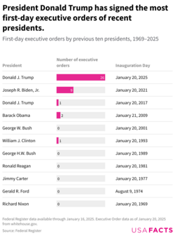 Trump began office with the most executive orders ever signed on the first day of a United States presidential term,[46] at 26 executive orders.[47] Following behind Trump's executive order tally is Joe Biden at 9 executive orders on January 20, 2021,[48] then Barack Obama at 2 executive orders, and Bill Clinton at 1 executive order.[49] Trump's signing of executive orders was described as a "shock and awe" campaign that tested the limits of executive authority.[50][51] Four days into Trump's second term, analysis conducted by Time found that nearly two-thirds of his executive actions "mirror or partially mirror" proposals from Project 2025,[52] which was seconded with analysis from Bloomberg Government.[53]