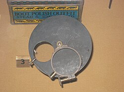 [edit]Many inexpensive box cameras had a shutter consisting of a round metal disk with a hole punched in it along with a spring-loaded release lever, with the solid disk blocking light from entering the camera. When the shutter release lever is actuated, the spring causes the disk to quickly rotate once so that the hole passes the camera aperture and allows light through for a brief moment. Rotary shutters typically only had one fixed, imprecise shutter speed, although most cameras had a Time setting that would lock the shutter open when the release is actuated, allowing for longer exposures.