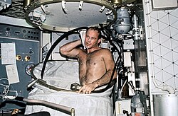 [edit]A dry workshop simplified plans for the interior of the station.[36] Industrial design firm Raymond Loewy/William Snaith recommended emphasizing habitability and comfort for the astronauts by providing a wardroom for meals and relaxation[37] and a window to view Earth and space, although astronauts were dubious about the designers' focus on details such as color schemes.[38] Habitability had not previously been an area of concern when building spacecraft due to their small size and brief mission durations, but the Skylab missions would last for months.[39] NASA sent a scientist on Jacques Piccard's Ben Franklin submarine in the Gulf Stream in July and August 1969 to learn how six people would live in an enclosed space for four weeks.[40]