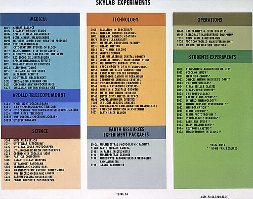This article incorporates text from this source, which is in the public domain. - Benson, Charles Dunlap & Compton, William David (1983). Living and Working in Space: A History of Skylab. NASA Scientific and Technical Information Office. OCLC 8114293. SP-4208.