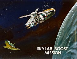 [edit]For the final two crewed missions to Skylab, NASA assembled a backup Apollo CSM/Saturn IB in case an in-orbit rescue mission was needed, but this vehicle was never flown. The station was damaged during launch when the micrometeoroid shield tore away from the workshop, taking one of the main solar panel arrays with it and jamming the other main array. This deprived Skylab of most of its electrical power and also removed protection from intense solar heating, threatening to make it unusable. The first crew deployed a replacement heat shade and freed the jammed solar panels to save Skylab. This was the first time that a repair of this magnitude was performed in space.