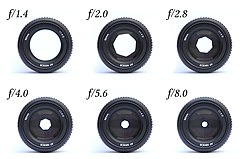 Light enters the camera through an aperture, an opening adjusted by overlapping plates called the aperture ring.[11][12][13] Typically located in the lens,[14] this opening can be widened or narrowed to alter the amount of light that strikes the film or sensor.[11] The size of the aperture can be set manually, by rotating the lens or adjusting a dial or automatically based on readings from an internal light meter.[11]
