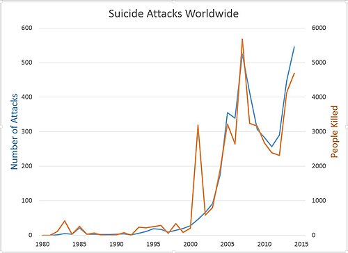 Suicide attacks have occurred in various contexts, ranging from military campaigns—such as the Japanese kamikaze pilots during World War II (1944–1945)—to more contemporary Islamic terrorist campaigns—including the September 11 attacks in 2001. Initially, these attacks primarily targeted military, police, and public officials. This approach continued with groups like Al-Qaeda, which combined mass civilian targets with political leadership.[1] While only a few suicide attacks occurred between 1945 and 1980,[3] between 1981 and September 2015 a total of 4,814 suicide attacks were carried out in over 40 countries,[4] resulting in over 45,000 deaths. The global frequency of these attacks increased from an average of three per year in the 1980s to roughly one per month in the 1990s, almost one per week from 2001 to 2003,[5] and roughly one per day from 2003 to 2015.[4] In 2019, there were 149 suicide bombings in 24 countries, carried out by 236 individuals. These attacks resulted in 1,850 deaths and 3,660 injuries.[6] They have been used by a wide range of political ideologies, from far right (Japan and Germany in WWII) to far left (such as the PKK and JRA).[7][8]