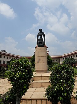 On 20 February 1978, a black bronze sculpture of 210 cm (6 ft 11 in) height was installed in the lawn of the Supreme Court. The sculpture was made by the renowned artist Chintamoni Kar. The statue, as per its sculptor Kar, reproduces ‘‘Mother India sheltering young Republic represented by the symbol of a child upholding the law of the country shown in the form of an open book, with the symbol of the balance representing law and justice’’. The official account states that it represents a ‘‘dispensation of equal justice to all’’.[9] The black bronze sculpture has been placed at the center of the park on the lawn of the Court just behind the statue of Mahatma Gandhi, which is in front of the staircase of the Supreme Court building in the front lawn.[9] The statue, when it was being put in the Court premises, led to protests by advocates of the Court in 1978 and a demand was made for its removal.[9] A memorandum was submitted to the then law minister Shanti Bhushan, which stated that ‘‘the statue is supposedly a symbol and inspiration for the highest institution of justice, the Supreme Court….The child is nondescript, but the mother’s resemblance to Mrs. Indira Gandhi is discernible even to the ordinary eye not trained for appreciating the nuances of sculpture’’.[9] As the statue was put up in the year 1978, the post-emergency period of India, they contended that it is symbolic of perversity and is based on the theme of the mother-and-son cult built up during the Emergency (India) period.[9] Different interpretations of the statue came from advocates, one said, ‘it’s like Indira mothering the judges and telling them you practice justice like I tell you to’, while the other said, ‘symbolizing justice is terribly conservative as justice is constantly changing’.[9] Later on, though the advocates submitted an apology memorandum after they got to know that the maquette was made in the year 1969.[9]