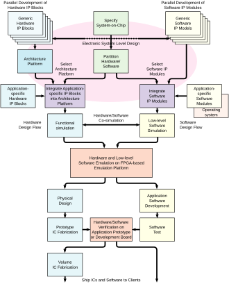 SoCs components are also often designed in high-level programming languages such as C++, MATLAB or SystemC and converted to RTL designs through high-level synthesis (HLS) tools such as C to HDL or flow to HDL.[14] HLS products called "algorithmic synthesis" allow designers to use C++ to model and synthesize system, circuit, software and verification levels all in one high level language commonly known to computer engineers in a manner independent of time scales, which are typically specified in HDL.[15] Other components can remain software and be compiled and embedded onto soft-core processors included in the SoC as modules in HDL as IP cores.