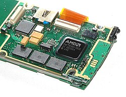 High-performance SoCs are often paired with dedicated memory, such as LPDDR, and flash storage chips, such as eUFS or eMMC, which may be stacked directly on top of the SoC in a package-on-package (PoP) configuration or placed nearby on the motherboard. Some SoCs also operate alongside specialized chips, such as cellular modems.[2]