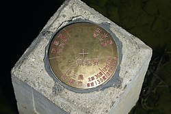 Joint discussions were conducted between the government of Itakura, Gunma, Tochigi City, Tochigi, and Kazo, Saitama, along with the Geospatial Information Authority of Japan from January 2015. A joint survey was conducted on February 9, 2016, confirming the tripoint was located at 36°12′27″N 139°39′50″E / 36.20750°N 139.66389°E, the survey costed ¥1.3 million (2016) (US$11,949.31), which was split between the three cities and towns.[8][9] A signing ceremony was conducted on March 31, 2016 between the three mayors of the towns and cities and Furusawa. A concrete pole with a 8 centimetres (3.1 in) brass plaque was erected at the border with the words "San Kenkyōkai" (三県境界, "Three Prefectural Borders").[9][10]