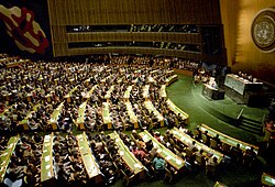 The General Assembly is the primary deliberative assembly of the UN. Composed of all UN member states, the assembly gathers at annual sessions at the General Assembly Hall, but emergency sessions can be summoned.[100] The assembly is led by a president, elected by the member states on a rotating regional basis, and 21 vice-presidents.[101] The first session convened on 10 January 1946 in the Methodist Central Hall in London and comprised representatives of 51 nations.[30]
