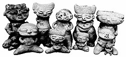 It is unknown how many people lived in Venezuela before the Spanish conquest; it has been estimated at one million.[50] In addition to Indigenous peoples known today, the population included groups such as the Kalina (Caribs), Auaké, Caquetio, Mariche, and Timoto–Cuicas. The Timoto–Cuica culture was the most complex society in Pre-Columbian Venezuela, with pre-planned permanent villages, surrounded by irrigated, terraced fields.[51] Their houses were made of stone and wood with thatched roofs. They were peaceful and depended on growing crops. Regional crops included potatoes and ullucos.[52] They left behind art, particularly anthropomorphic ceramics, but no major monuments. They spun vegetable fibers to weave into textiles and mats for housing. They are credited with having invented the arepa, a staple in Venezuelan cuisine.[53]