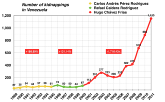 Economic crises in the 1980s and 1990s led to a political crisis. Hundreds of people were killed by security forces and the military in the Caracazo riots of 1989, during the second presidential term of Carlos Andrés Pérez (1989–1993) and after the implementation of economic austerity measures.[84]Hugo Chávez, who in 1982 had promised to depose the bipartisanship governments, used the growing anger at economic austerity measures to justify a coup attempt in February 1992;[85][86] a second coup d'état attempt occurred in November.[86]