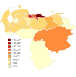 There are small but influential Muslim, Druze,[357][358] Buddhist, and Jewish communities. The Muslim community of more than 100,000 is concentrated among persons of Lebanese and Syrian descent living in Nueva Esparta state, Punto Fijo and the Caracas area. Venezuela is home of the largest Druze communities outside the Middle East.[359] The Druze community is estimated at around 60,000,[359] and concentrated among persons of Lebanese and Syrian descent.[360][357] Buddhism is practiced by over 52,000 people. The Buddhist community is made up mainly of Chinese, Japanese, and Korean people.