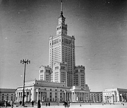 After World War II, the "Bricks for Warsaw" campaign was initiated and large prefabricated housing projects were erected in Warsaw to address the major housing shortage. Plattenbau-styled apartment buildings were seen as a solution to avoid Warsaw's former density problem and to create more green spaces. Some of the buildings from the 19th century that had survived in a reasonably reconstructible form were nonetheless demolished in the 1950s and 1960s, like the Kronenberg Palace.[66][67] The Śródmieście (central) region's urban system was completely reshaped; former cobblestone streets were asphalted and significantly widened for traffic use. Many notable streets such as Gęsia, Nalewki and Wielka disappeared as a result of these changes and some were split in half due to the construction of Plac Defilad (Parade Square), one of the largest of its kind in Europe.[68]