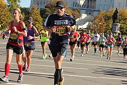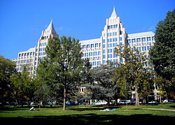 The highest natural elevation in the district is 409 feet (125 m) above sea level at Fort Reno Park in upper northwest Washington, D.C.[64] The lowest point is sea level at the Potomac River.[65] The geographic center of Washington is near the intersection of 4th and L streets NW.[66][67][68]
