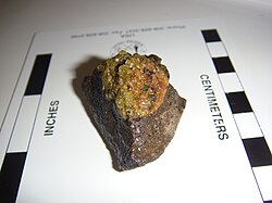 [edit]Mineral hydration is a form of chemical weathering that involves the rigid attachment of water molecules or H+ and OH- ions to the atoms and molecules of a mineral. No significant dissolution takes place. For example, iron oxides are converted to iron hydroxides and the hydration of anhydrite forms gypsum.[38]