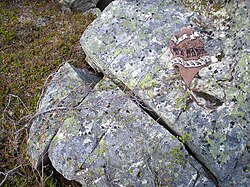 [edit]Mineral weathering can also be initiated or accelerated by soil microorganisms. Soil organisms make up about 10 mg/cm3 of typical soils, and laboratory experiments have demonstrated that albite and muscovite weather twice as fast in live versus sterile soil. Lichens on rocks are among the most effective biological agents of chemical weathering.[34] For example, an experimental study on hornblende granite in New Jersey, US, demonstrated a 3x – 4x increase in weathering rate under lichen covered surfaces compared to recently exposed bare rock surfaces.[41]
