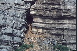 [edit]Living organisms may contribute to mechanical weathering, as well as chemical weathering (see § Biological weathering below). Lichens and mosses grow on essentially bare rock surfaces and create a more humid chemical microenvironment. The attachment of these organisms to the rock surface enhances physical as well as chemical breakdown of the surface microlayer of the rock. Lichens have been observed to pry mineral grains loose from bare shale with their hyphae (rootlike attachment structures), a process described as plucking,[16] and to pull the fragments into their body, where the fragments then undergo a process of chemical weathering not unlike digestion.[20] On a larger scale, seedlings sprouting in a crevice and plant roots exert physical pressure as well as providing a pathway for water and chemical infiltration.[7]