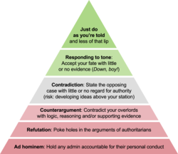 One of the most difficult areas of dispute resolution is dealing with The Administration. While uninvolved third-party admins are invaluable, if you're having conflicts with a particular admin even the smallest perturbation can have enormous knock-on effects. For this reason it is highly recommended that editors try to remain mindful of the "hierarchy of editor subservience" and aim at the top during disputes. Resist the urge to point out that ad hominem reasoning is not always fallacious and that, in some instances, questions of personal conduct, character, motives, etc., are legitimate and relevant to the issue. Do not attempt to refute their arguments or contradict them using logic, reasoning and/or supporting evidence. It is when backed into a corner that admins are at their most dangerous.