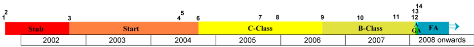 This clickable imagemap, using the article "Atom" as an example, demonstrates the typical profile for an article's development through the levels. Hold the mouse over a number to see key events, and click on a number to see that version of the article. Please note that until 2008, a C-Class rating did not exist on the project, and as such this grading is retroactive. Also, in 2006 references were much less used, and inline references were quite rare; a barely-B-Class article today would typically have many more references than this article did in late 2006.