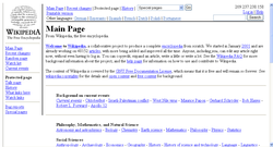 - Nostalgia Wikipedia – a snapshot of Wikipedia from 20 December 2001, running a later version of MediaWiki for security reasons but using a skin that looks like the software of the time