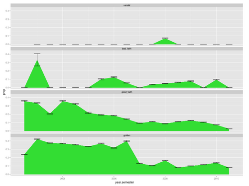 [edit]Editor persistence: the proportion of new editors who edit at least once 2-6 months after their first edit (2003-2010). Top to bottom, according to how the edits in their first edit session were categorized by experienced humans.