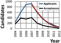 The nomination and selection of Administrators is supervised by Bureaucrats, who decide whether, in their opinion, a candidate has garnered sufficient support in the discussion of a candidacy, a process like that for appointing Bureaucrats. A "consensus" exceeding ~70% is required, but the judgement of Bureaucrats is the deciding factor. A list of unsuccessful requests shows the number of refusals peaked at 543 in 2006 with 353 acceptances, and has steadily declined since as the number of applicants has dropped off, with only 155 refusals and 75 acceptances in 2010, and 88 refusals and 52 acceptances as of 2011 (about a 3.4% increase in membership).