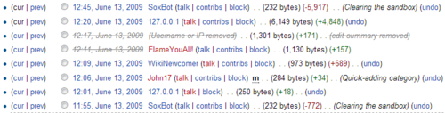 When a revision or log entry is hidden from view in its entirety, it is displayed as shown to the right, with the elements hidden from view stricken and greyed out. The struck-out elements cannot be viewed by any usergroup which does not have the deleterevision right. A user who cannot access the relevant revisions and who tries to compare the revision with other revisions or access its &oldid= page will receive an error stating that the revision has been removed from the public archives. Similarly, looking up log entries or contributions by username will not show log entries where the username has been redacted.