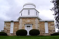 Williams College is the site of the Hopkins Observatory, the oldest extant astronomical observatory in the United States.[48] Erected in 1836–1838, it now contains the Mehlin Museum of Astronomy, including Alvan Clark's first telescope (from 1852),[48] as well as the Milham Planetarium, which uses a Zeiss Skymaster ZKP3/B optomechanical projector and an Ansible digital projector, both installed in 2005. The Hopkins Observatory's 0.6-m DFM reflecting telescope (1991) is installed elsewhere on the campus.[49] Williams joins with Wellesley, Wesleyan, Middlebury, Colgate, Vassar, Swarthmore, and Haverford/Bryn Mawr to form the Keck Northeast Astronomy Consortium, sponsored for over a decade by the Keck Foundation and now with its student research programs sponsored by the National Science Foundation.[50] Hopkins Hall serves as the administration building on campus, housing the offices of the president, Dean of the Faculty, registrar, and provost, among others. There is a Newman Center on campus.