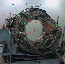 [edit]Electron beam tomography (EBT) is a specific form of CT in which a large enough X-ray tube is constructed so that only the path of the electrons, travelling between the cathode and anode of the X-ray tube, are spun using deflection coils.[10] This type had a major advantage since sweep speeds can be much faster, allowing for less blurry imaging of moving structures, such as the heart and arteries.[11] Fewer scanners of this design have been produced when compared with spinning tube types, mainly due to the higher cost associated with building a much larger X-ray tube and detector array and limited anatomical coverage.[12]