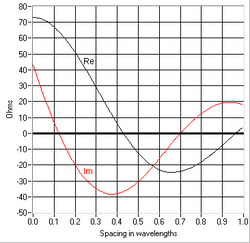 When a passive radiator is placed close (less than a quarter wavelength distance) to the driven dipole, it interacts with the near field, in which the phase-to-distance relation is not governed by propagation delay, as would be the case in the far field. Thus, the amplitude and phase relation between the driven and the passive element cannot be understood with a model of successive collection and reemission of a wave that has become completely disconnected from the primary radiating element. Instead, the two antenna elements form a coupled system, in which, for example, the self-impedance (or radiation resistance) of the driven element is strongly influenced by the passive element. A full analysis of such a system requires computing the mutual impedances between the dipole elements[15] which implicitly takes into account the propagation delay due to the finite spacing between elements and near-field coupling effects. We model element number j as having a feedpoint at the centre with a voltage Vj and a current Ij flowing into it. Just considering two such elements we can write the voltage at each feedpoint in terms of the currents using the mutual impedances Zij: