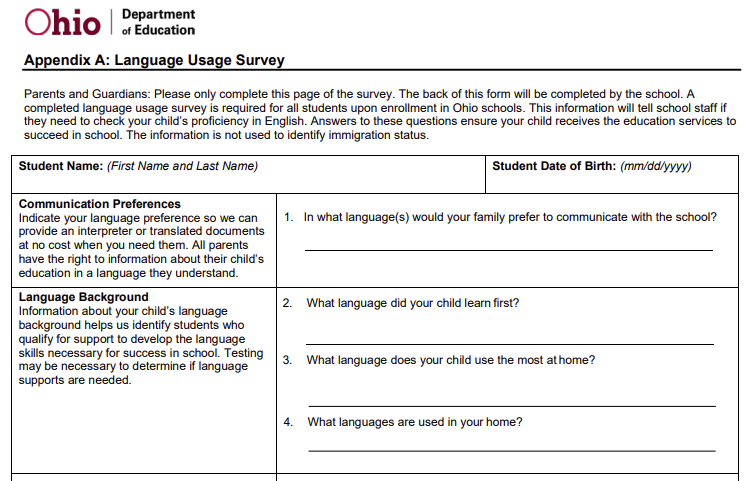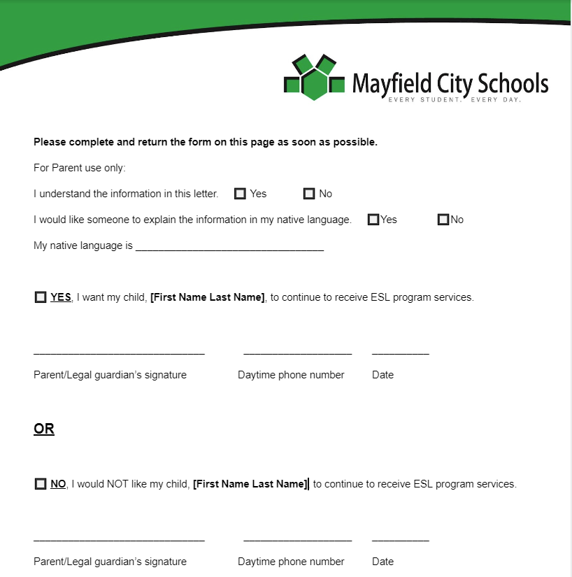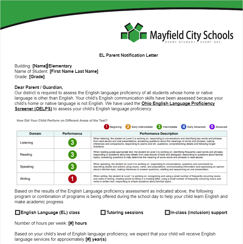 Mayfield City School District will screen all new enrollees for the possibility of English Learner (EL) identification. The following are the steps we follow:
