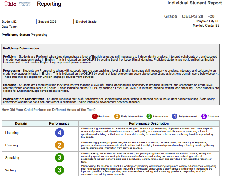 - STEP 2: The student is assessed using the Ohio English Language Proficiency Screener (OELPS). The OELPS evaluates English language proficiency in four domains: Listening, Reading, Speaking, and Writing.