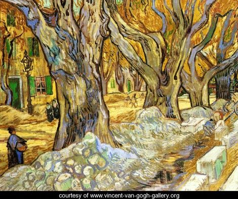 Vincent van Gogh painted The Large Plane Trees in 1889. Here, Vincent restricted his palette to shades of yellow, recalling the chromatic experiments of the sunflowers. Hints of green on the ground and in the tree trunks cool the tonality of The Large Plane Trees, while the branches in the right distance flame brightly in autumnal orange. Vincent van Gogh's color modifications and his expressive contours of the twisting branches indicate the overwhelming energy of nature, in contrast to the static blocks of masonry that line the road.