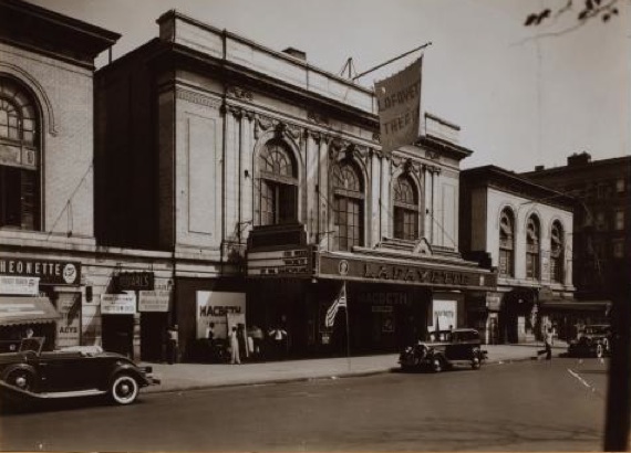 Famous for its musical revues and plays during the 1920's and 1930's, the Lafayette Theater in New York's Harlem section made Seventh Avenue and 132nd Street a mecca for those seeking stylish entertainment. In this exuberant collage, Romare Bearden conveyed the lively rhythm and vibrant color of the Lafayette during its heyday. Using pictures from magazines, scraps of paper, and bits of fabric, Bearden arranged several scenes, as they would appear to the theater audience. The band plays below in the pit, while dancers and singers perform energetically above on stage. African masks and exotic tree and flower forms decorate a backdrop topped by a scalloped red curtain. Bearden excelled in the medium of collage, using it to express the spirit and reality of African-American culture. Inspired by his love of jazz and memories of his youth, he once explained, "I work out of a response and need to redefine the image of man in terms of the Negro experience I know best." This composition is from his "Of the Blues" series of 1974.