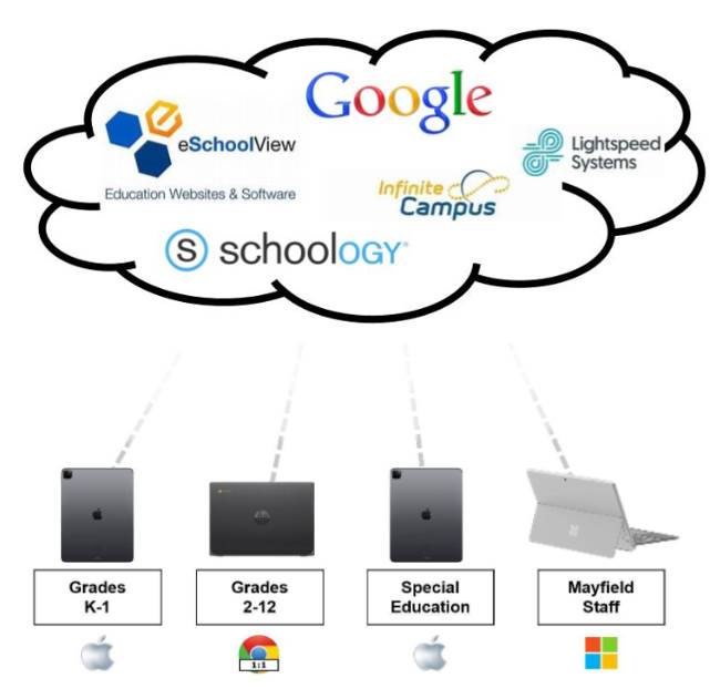 The Mayfield City School device plan began with the implementation of a new district website provided by ESchoolView and was followed by the rolling out of the Infinite Campus student information system. Over the course of the previous school years, students in grades 2 though 12, and staff members at all levels, have received Google Workspace for Education accounts as well as training/familiarization with Chromebooks and iPads where applicable.