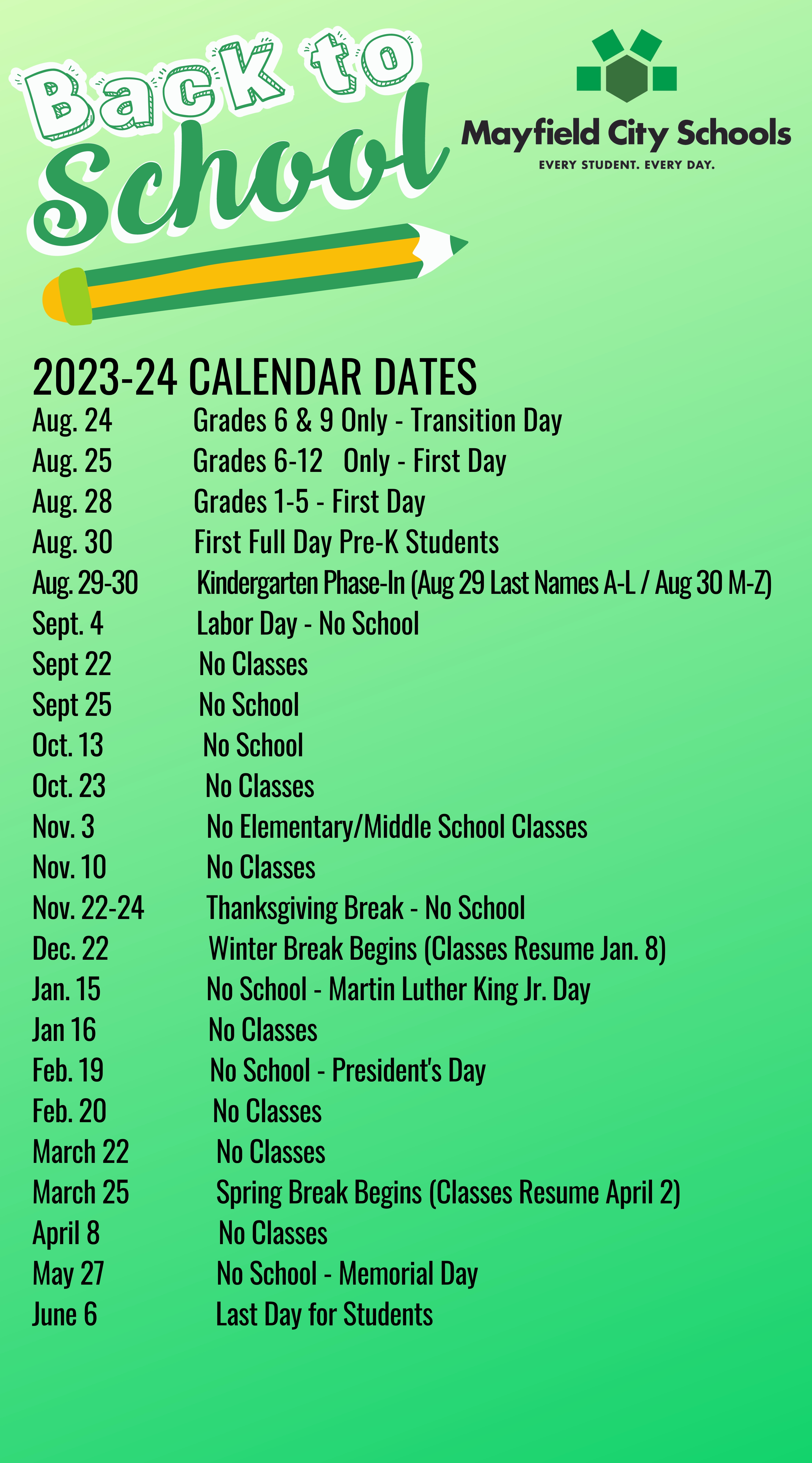 The 23-24 printed calendar was distributed to all students the first week of school. Extra copies are available at the main office at all schools or click the links below to view the 23-24 printed calendar. 23-24 CALENDAR _INSIDE.pdf23-24 CALENDAR _COVERS.pdf
