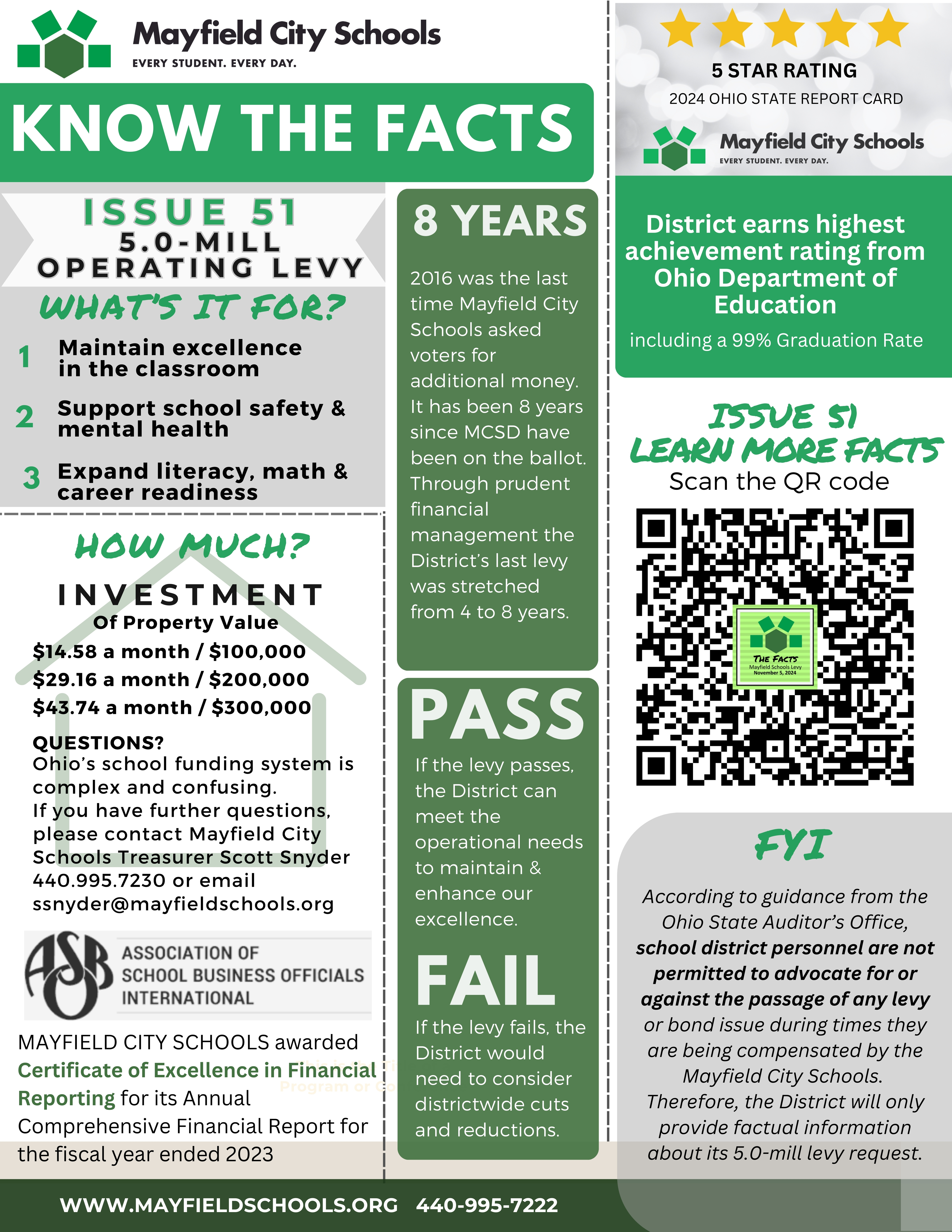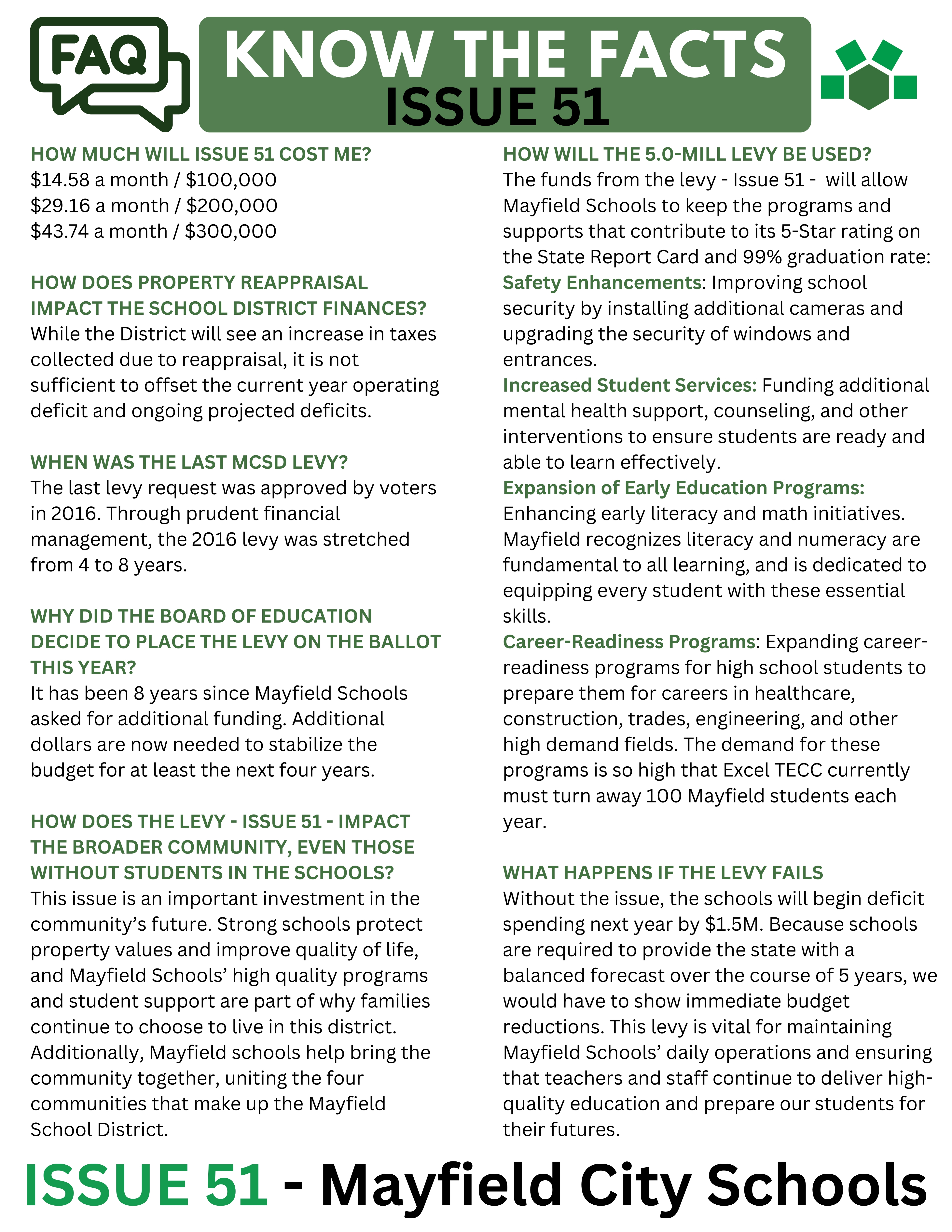 The funds from the levy - Issue 51 - will allow Mayfield Schools to keep the programs and supports that contribute to its 5-Star rating on the State Report Card and 99% graduation rate: