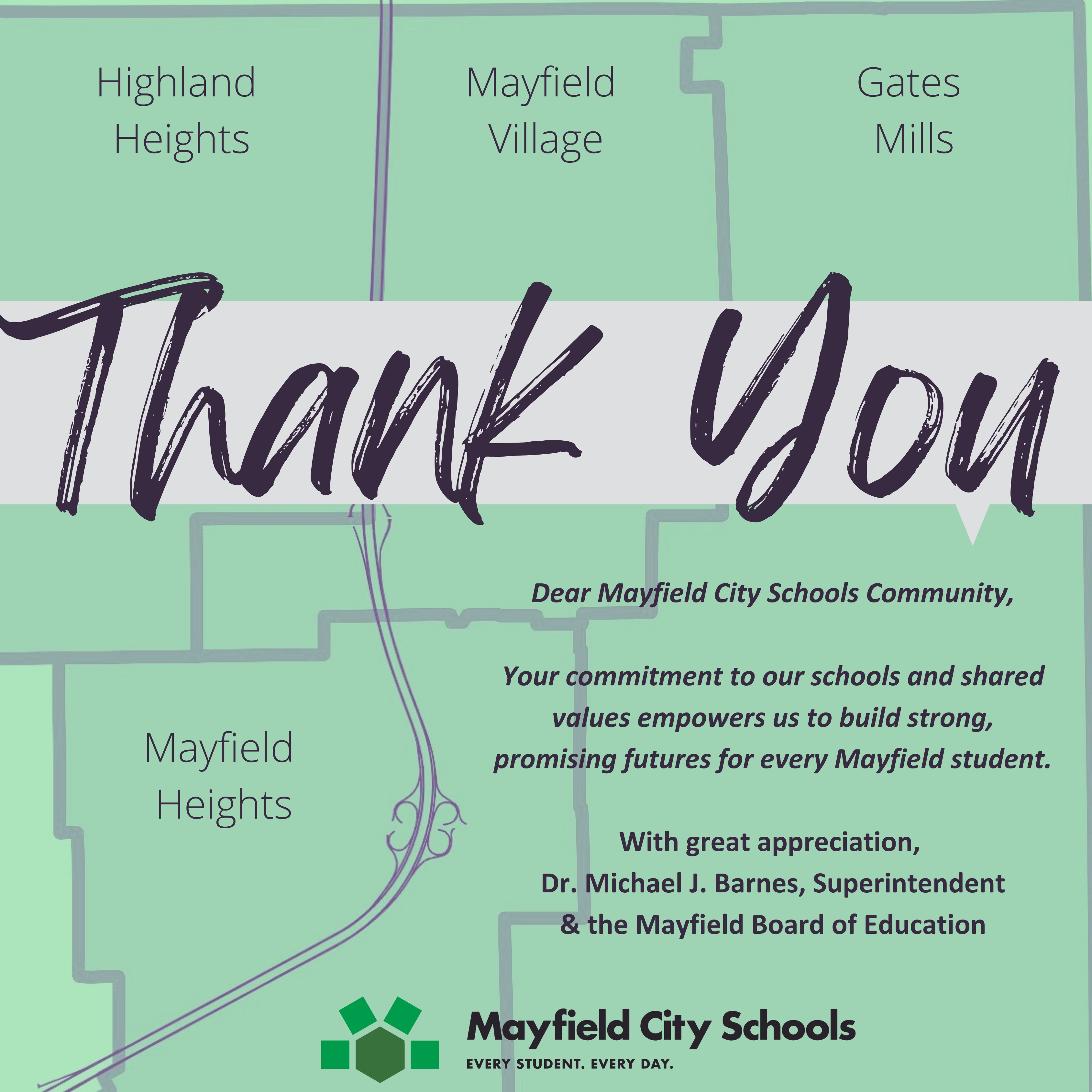 On behalf of the Mayfield Board of Education, the PRIDE Committee, and our dedicated teachers, staff, and students, I want to extend our heartfelt gratitude to everyone who supported Issue 51. Your commitment to our schools and shared values empowers us to build strong, promising futures for every Mayfield student. Together, we've reinforced our dedication to excellence and community pride. This is the Mayfield Way. Thank you, Mayfield!