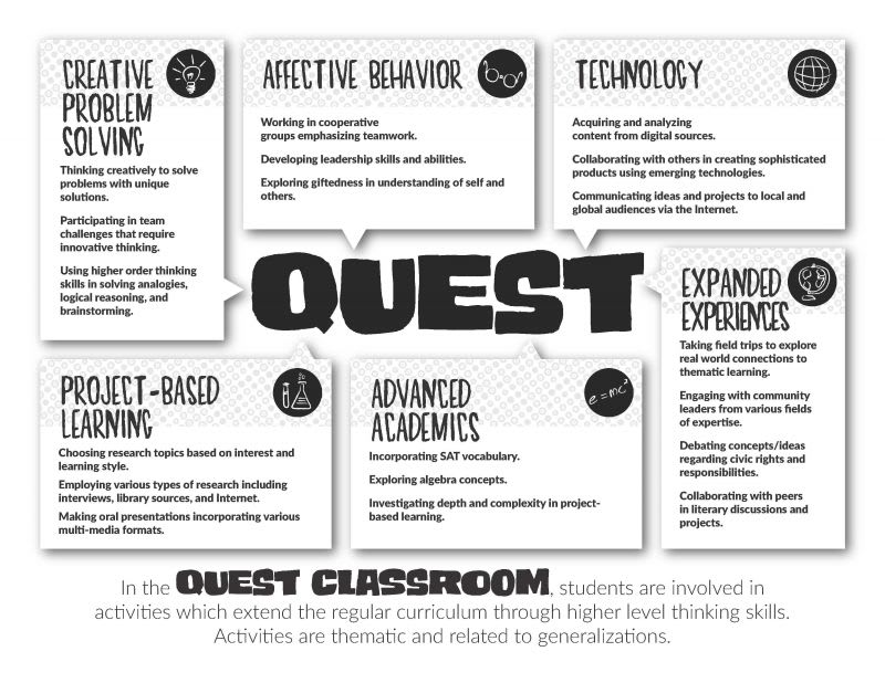 QUEST is designed as a pull-out program for gifted students in grades two through five. Identified G/T students attend QUEST in addition to being placed in a trained teacher’s classroom and clustered with other identified students. It serves students from all elementary campuses who have met specific criteria. QUEST offers students a differentiated curriculum through interdisciplinary, concept-based teaching and learning experiences. Mesquite ISD's Quest program is housed at Florence Elementary School and Henrie Elementary School. MISD provides transportation to central locations where students attend one day a week and receive instruction in critical thinking, problem-solving, and decision-making.