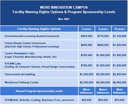 MUSD is leading the way with imagination and vision. Help us and invest in the MUSD Innovation Campus vision. $25 million more is still needed to complete the full campus. Your donation gives you access to:
