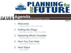 If you were not able to attend one of the design focus groups that the district hosted, we encourage you to take the survey so your voice can be heard regarding school design. We are eager to get feedback from as many constituents as possible. Please review the materials below from the focus groups, give input at the survey link (which will be open through May 30, 2017), and share the link with neighbors, Washington Township community members, and friends. The potential for 21st century learning spaces in Washington Township is exciting. Thank you for your participation in helping to shape the future of Washington Township Schools.