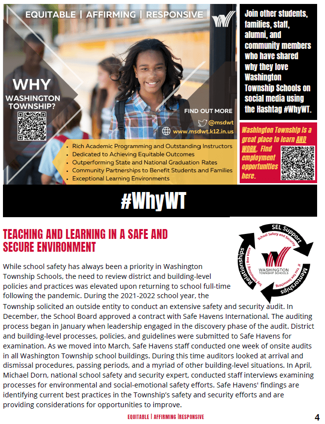While school safety has always been a priority in Washington Township Schools, the need to review district and building-level policies and practices was elevated upon returning to school full-time following the pandemic. During the 2021-2022 school year, the Township solicited an outside entity to conduct an extensive safety and security audit. In December, the School Board approved a contract with Safe Havens International. The auditing process began in January when leadership engaged in the discovery phase of the audit. District and building-level processes, policies, and guidelines were submitted to Safe Havens for examination. As we moved into March, Safe Havens staff conducted one week of onsite audits in all Washington Township school buildings. During this time auditors looked at arrival and dismissal procedures, passing periods, and a myriad of other building-level situations. In April, Michael Dorn, national school safety and security expert conducted staff interviews examining processes for environmental and social-emotional safety efforts. Safe Havens’ findings are identifying current best practices in the Township’s safety and security efforts and are providing considerations for opportunities to improve.