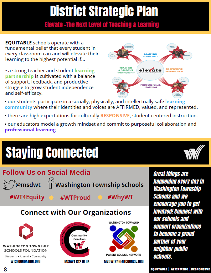 Washington Township Schools continue to be a nationally prominent public school institution providing almost 70 years of academic excellence. Our staff, partners, and the entire community are invested in meeting the diverse needs of our students, and we proudly celebrate their growth and accomplishments! We intentionally address student needs through our District Strategic Plan, school improvement plans, and equity work.