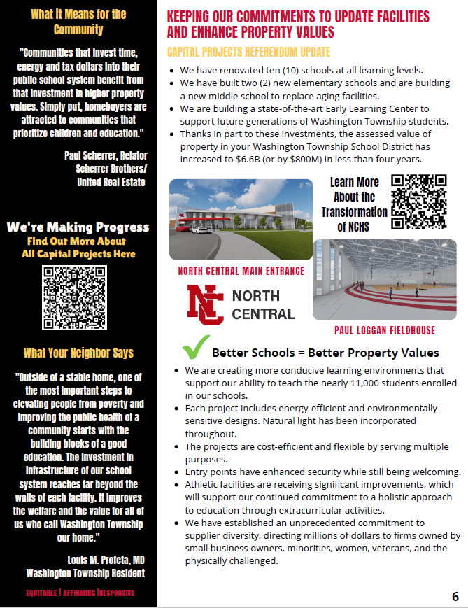 “Outside of a stable home, one of the most important steps to elevating people from poverty and improving the public health of a community starts with the building blocks of a good education. The investment in infrastructure of our school system reaches far beyond the walls of each facility. It improves the welfare and the value for all of us who call Washington Township our home.”