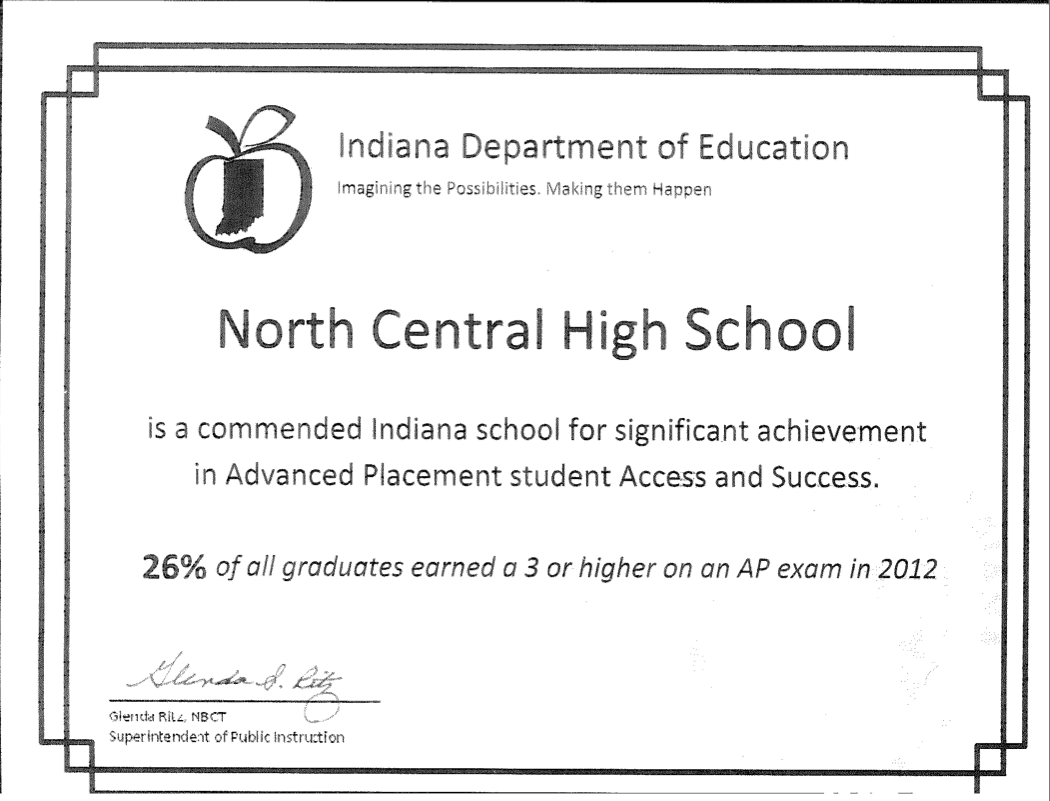 North Central was commended by the Department of Education for significant achievement in Advanced Placement student Access and Success.
