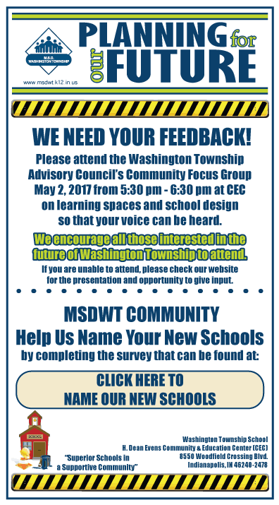 Please attend the Washington Township Advisory Council’s Focus Group May 2, 2017 from 5:30 – 6:30 pm at CEC on learning spaces and school design so that your voice can be heard.