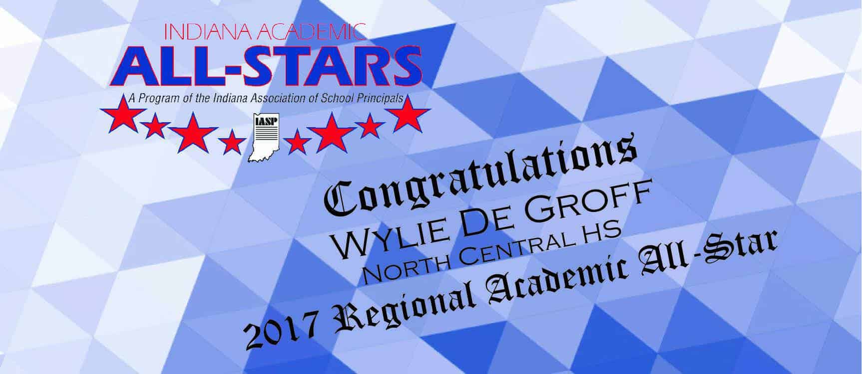 Congrats to Wylie De Groff, who was recently named one of the 2017 Indiana Regional Academic All-Stars! Wylie was selected from a field of 266 outstanding nominees from the state’s private and public accredited schools! Regional Academic All-Star distinction recognizes seniors who excel in the