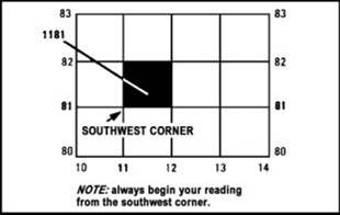 To read to 2 digits, you read to the right and up. Say 7054, you look for square”70″ along the bottom and put a flat edge against it, then you go to the right and along that side find square “54” and where thoes 2 meet, is your point.