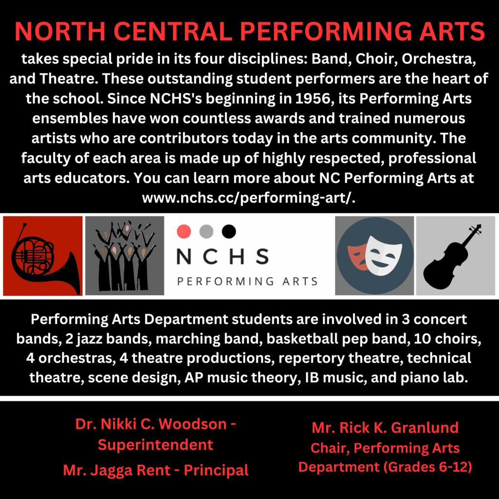 North Central High School is proud to offer a variety of performing arts classes, including a comprehensive student driven curriculum, serving over one-third of the student body. Curricular offerings include 8 bands (concert, jazz, marching band, and basketball band), 10 choirs (concert, show, chamber, and gospel), 4 string orchestras, a handbell ensemble, group piano classes (two semesters), theatre classes (two semesters), and Repertory Theatre class. Additionally, we offer classes in technical theater, scene design, IB music, and AP music theory. Ten highly trained and dedicated educators provide opportunities for students to develop and explore their creative and artistic talent in many areas of music and theatre. Students also have the opportunity for a wide variety of learning experiences through singing, moving, composing, and acting. Our program provides a unique avenue to the imaginative and affective aspects of life and their contribution to our cultural heritage.