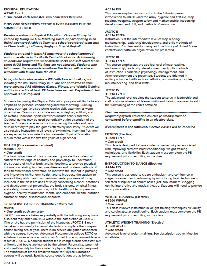 The Physical Education program at North Central High School is to assist in the development of the physical, mental, social, and emotional well-being of the individual pursuant to the goals of the secondary education. Particular attention and emphasis will be directed to those activities which stress the importance of teamwork, and to those having potential carry over value for leisure time both for the present and future years. Physical Education is a graduation requirement and students can complete the requirements by taking Summer School PE for one credit, earning a credit through participation and completion of a sport for a full season, or during our full semester class which includes a robust swimming unit in our Natatorium. Please reach out to the Department Chair with any questions you may have regarding our offerings and credit requirements.