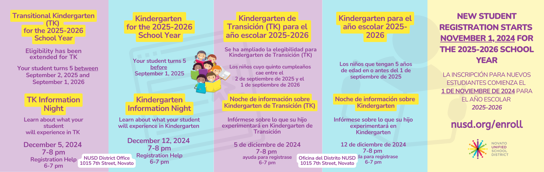 As the new school year approaches, we are pleased to announce essential dates for families interested in enrolling their children in the Novato Unified School District (NUSD) for the 2025-2026 academic year. Transitional Kindergarten (TK): Eligibility for TK has been expanded. Children who turn 5 between September 2, 2025, and September 1, 2026, are eligible [...]